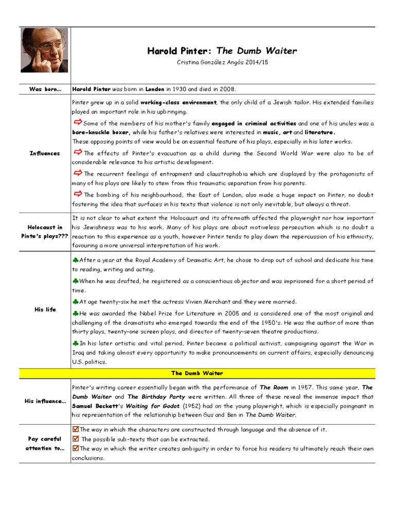 THE DUMB WAITER By Harold Pinter. Harold Pinter. THE DUMB WAITER Author: Scott Skinner Created Date: 11/4/2010 9:03:43 AM.